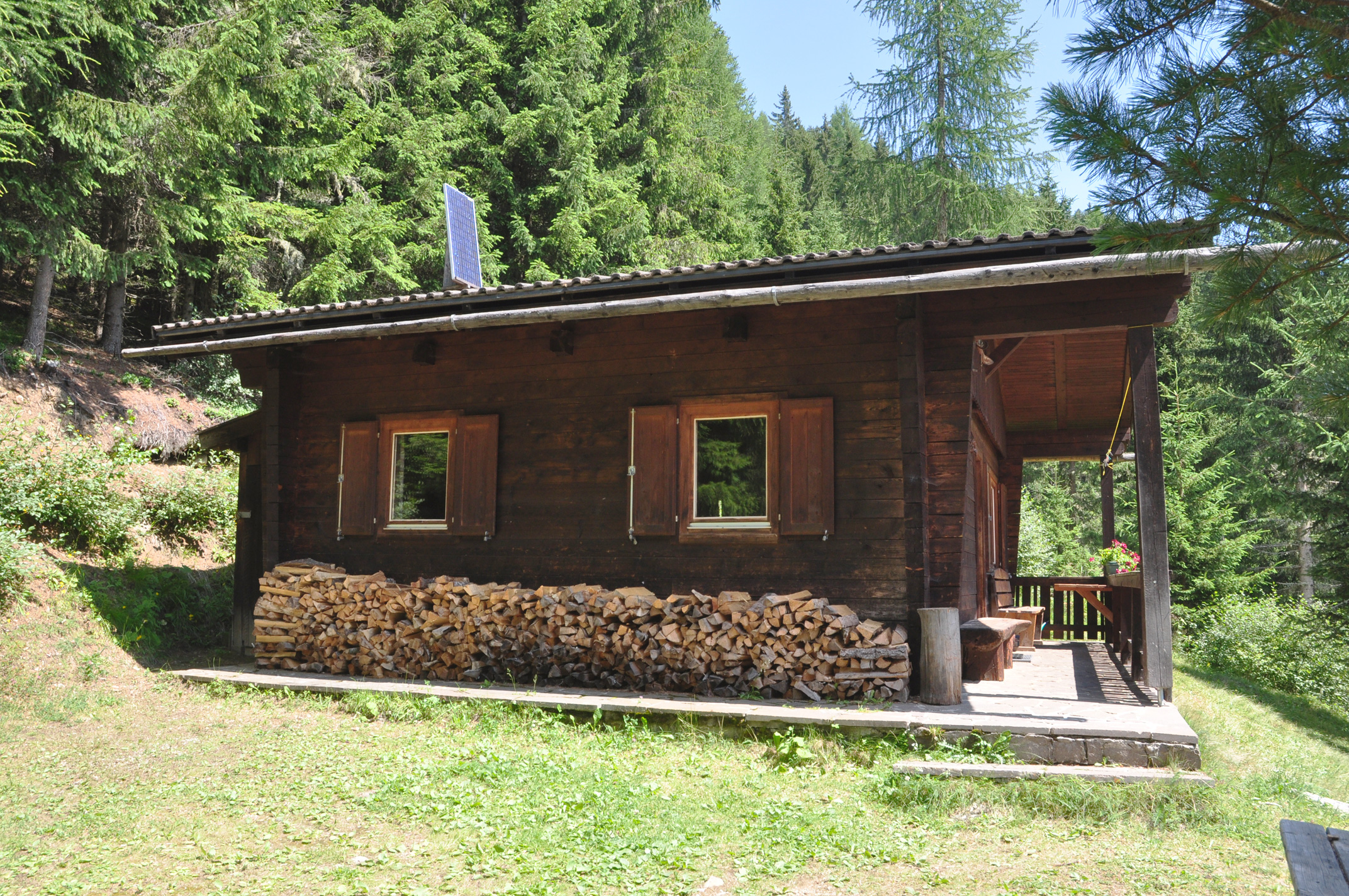 Die Hütte ist klassisch in Holzbauweise errichtet und hat einen kleine Terrasse die nach Süden ausgerichtet ist. Hier kann man am Abend noch lange die Sonne genießen.