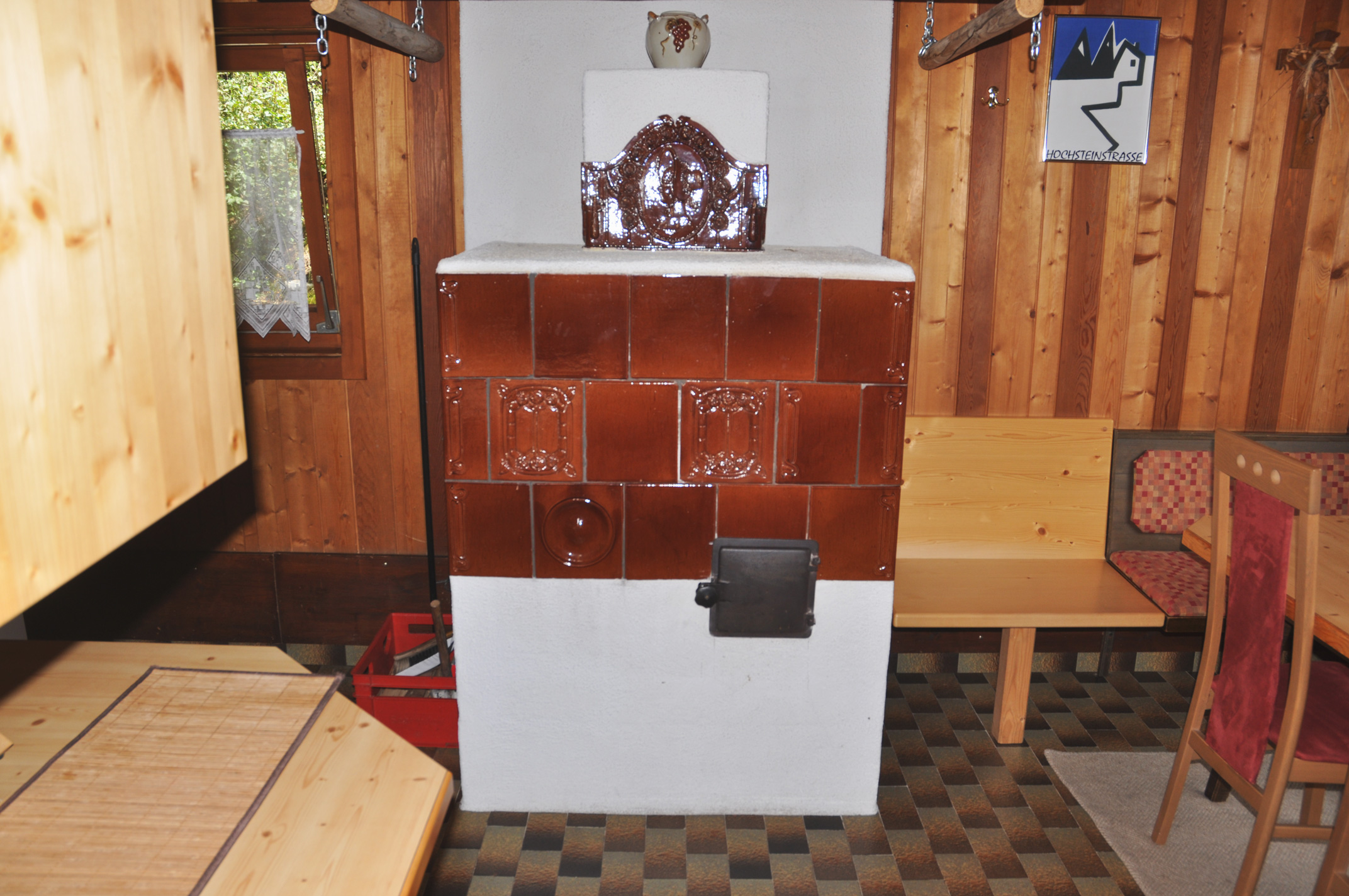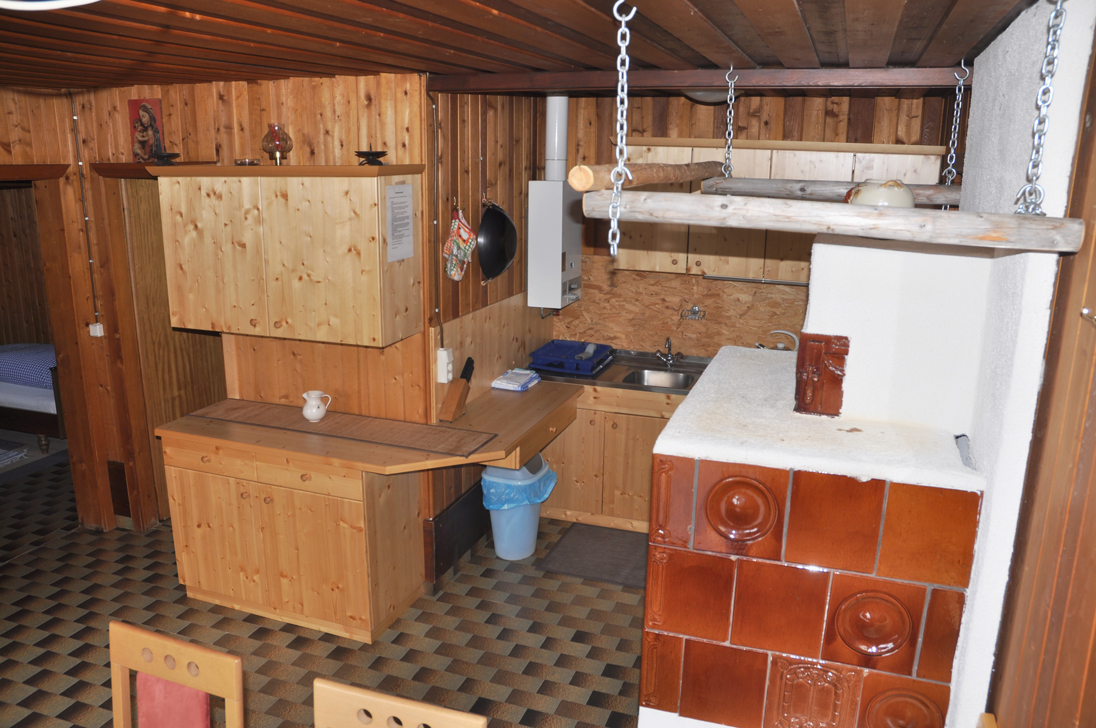 Geheizt wird mit Holz und mit einem großen Kachelofen der für angenehme Wärme sorgt. Gekocht wird auf einem Gasherd, ein Kühlschrank ist ebenfalls vorhanden. Auf der gegenüberliegenden Seite des offenen Kochbereichs steht ein großer Tisch mit Eckbank, an dem 6 Personen gemütlich sitzen können.