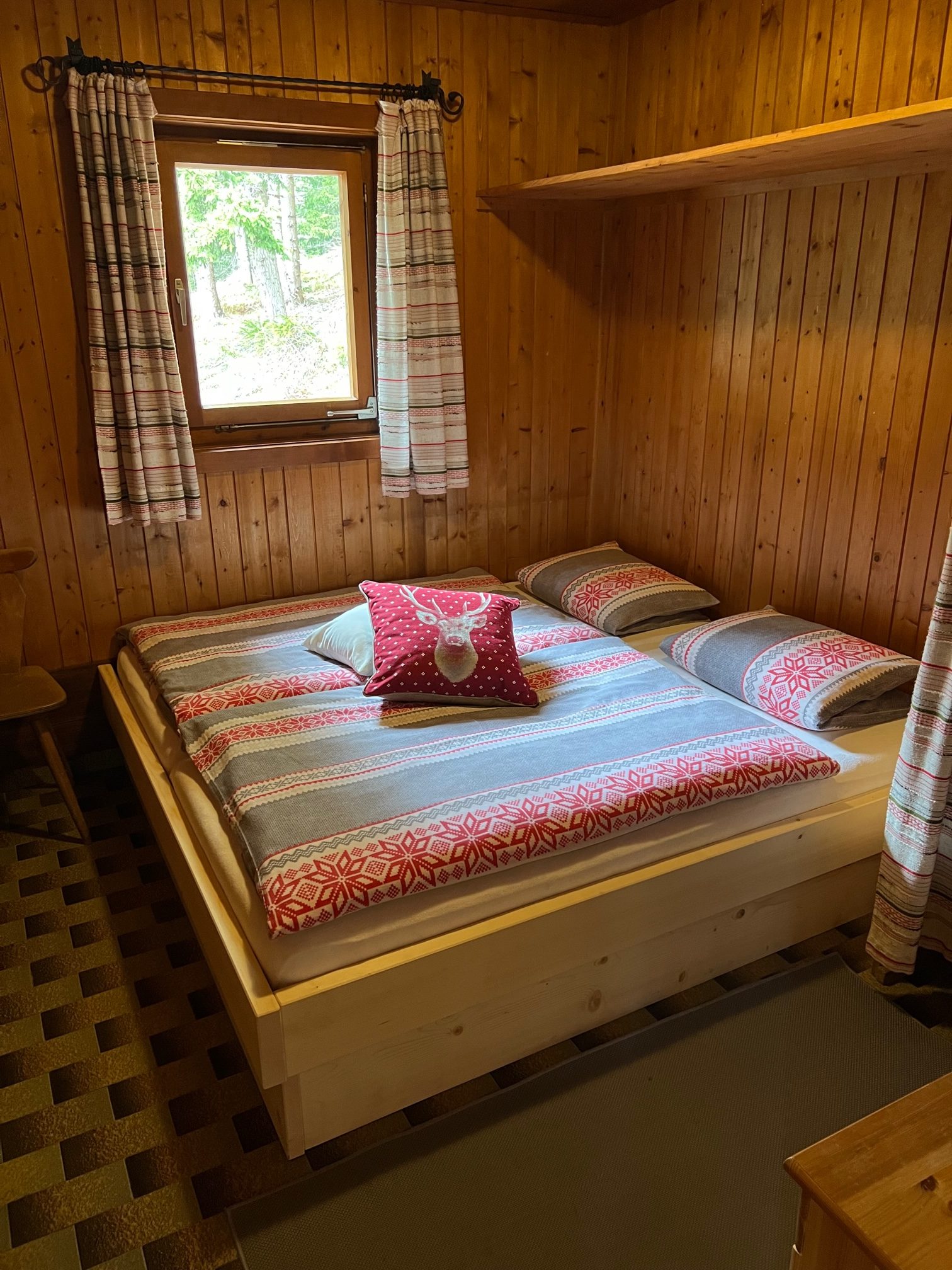 Die Hütte hat zwei Schlafzimmer: ein Zimmer mit zwei Einzelbetten, die als Doppelbett genutzt werden können. Das andere Zimmer hat ein Stockbett mit 2 Schlafplätzen und ein weiteres Einzelbett.