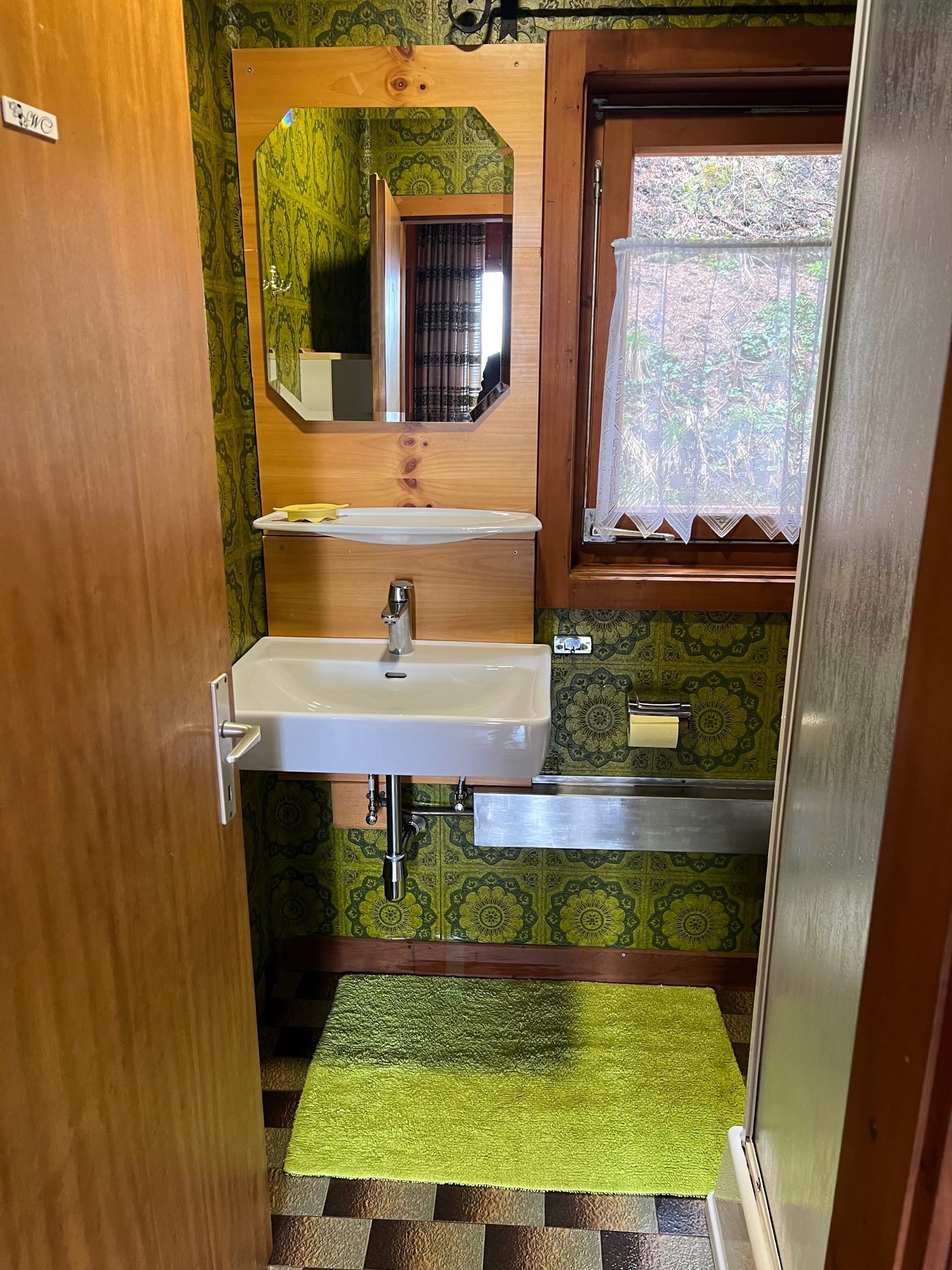 Sie ist mit fließend Kalt- & Warm-Wasser ausgestattet, hat ein Bad mit Spültoilette, Waschbecken und Dusche.